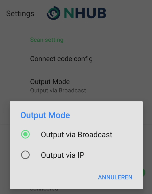 - Ga in de Nhub app onderin naar het tabblad 'Settings' en zorg dat de instelling 'Output Mode' staat ingesteld op 'Output via Broadcast'.