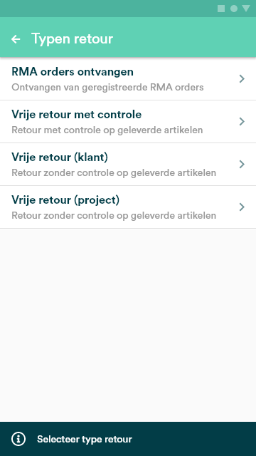 Om de Vrije retour functionaliteiten te openen, ga je vanuit het hoofdmenu van de app naar Retour van klant in de sectie Inkomend. Kies hier voor Vrije retour met controle, Vrije retour (klant) of Vrije retour (project)