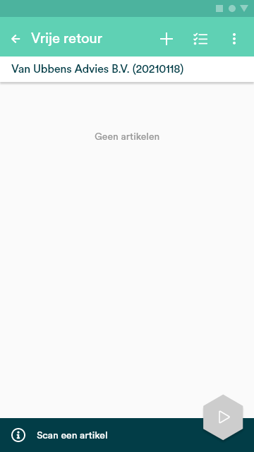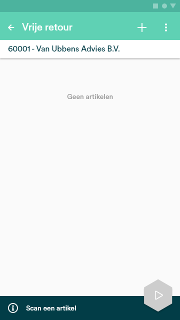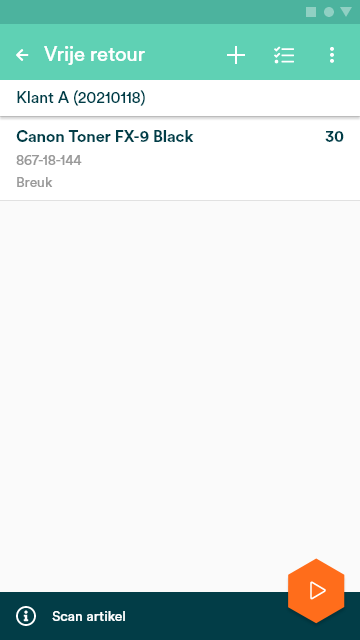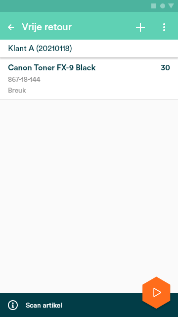 Nadat de klant is geselecteerd, kan je direct een artikel toevoegen aan de retour. Ook dit kan handmatig (via het plus icoontje) of via een scan van het artikel.