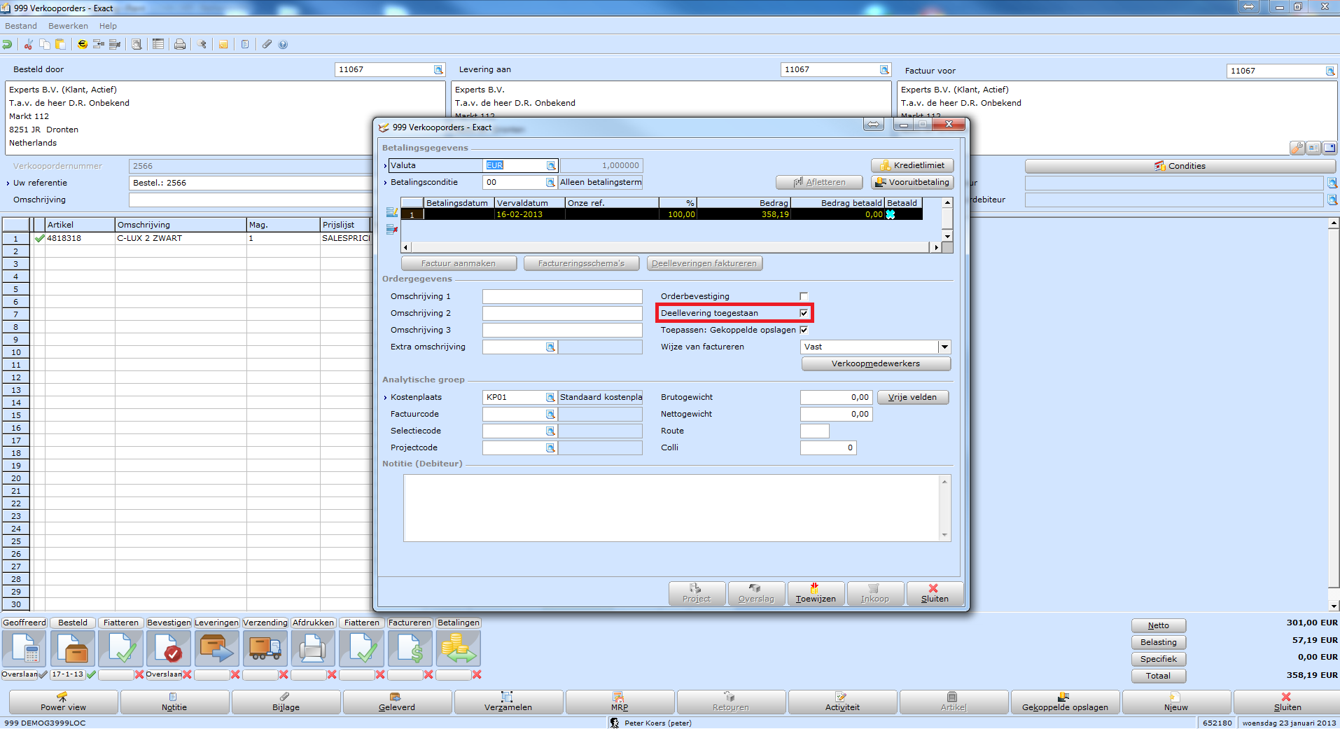 Het is in Exact mogelijk om aan te geven of er deelleveringen toegestaan zijn of niet. Dit kan ingesteld worden op debiteurniveau of op orderniveau. Hieronder wordt uitgelegd hoe je dit doet.