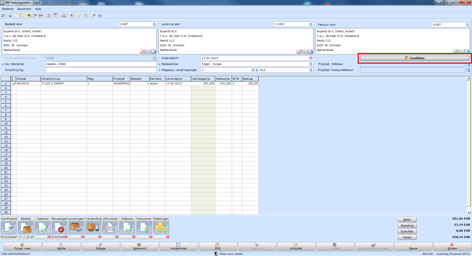 De verkooporder neemt automatisch de instelling van de debiteur over. Om af te wijken open je de order en druk je op de knop Condities.