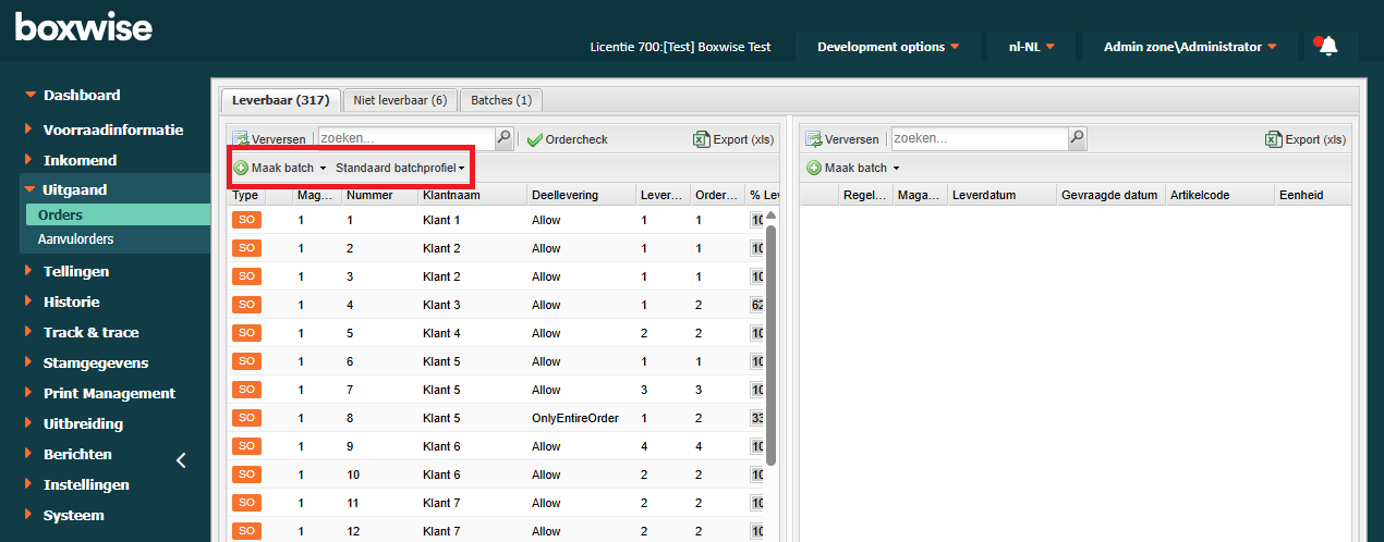 Op batch profielen staan allerlei instellingen die van invloed zijn op het overzicht van de leverbare orders en de manier waarop een batch wordt aangemaakt. Boven het overzicht van de leverbare orders zie je welk profiel actief is.