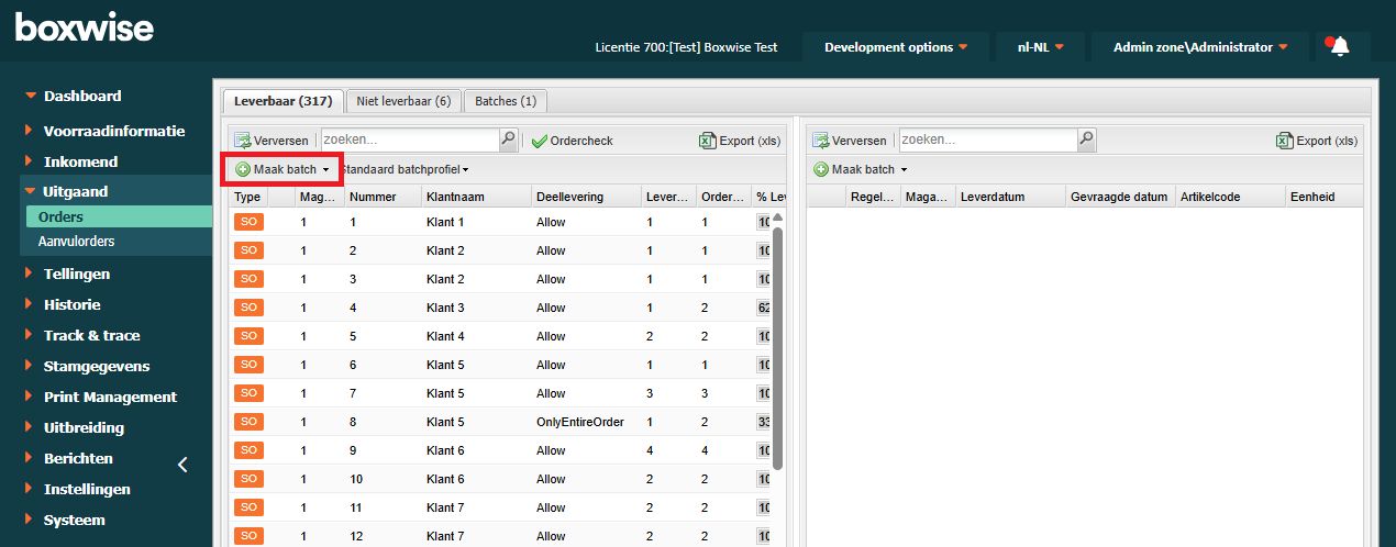 Het aanmaken van een batch gebeurt in het menu Leverbaar. Het aanmaken van een batch is niets anders dan het selecteren en samenvoegen van te leveren verkooporders of verkooporderregels waarna ze tot een te picken batch worden gevormd. Voer de onderstaande stappen uit om een batch te maken.