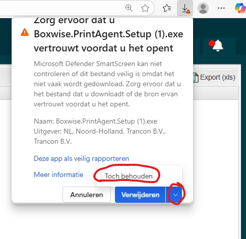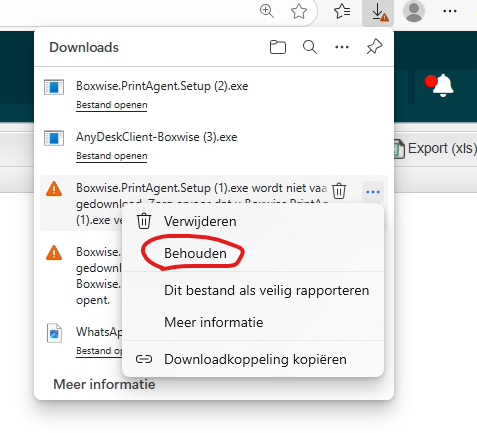 De lokale beveiliging laat het niet altijd toe om het installatie bestand van de boxwise print agent te installeren. Dit is te herkennen doordat je een uitroepteken logo ziet bij het bestand. In windows kan je er nog steeds voor zorgen dat je het bestand kunt installeren.