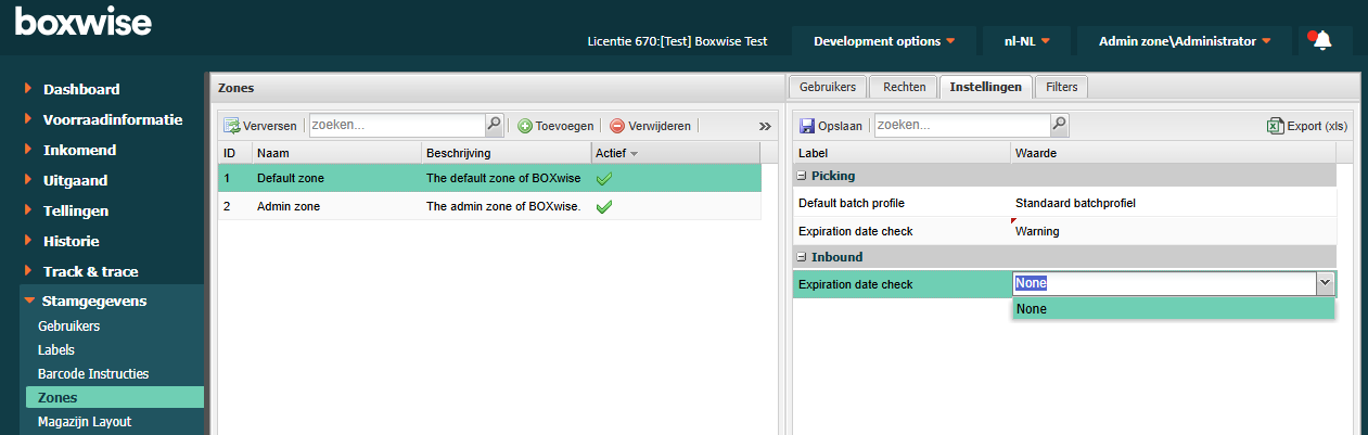 4. Ze de instelling Inbound > Expiration date check op Warning om te valideren bij ontvangst en zet de instelling Picking > Expiration date check op Warning om te valideren bij levering.