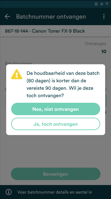 Vanaf versie 1.48 is het mogelijk om Boxwise te laten valideren of een artikel nog lang genoeg houdbaar is bij ontvangst en/of levering. Bij deze controle wordt er gevalideerd op de THT datum van een batchnummer. Wanneer het artikel niet voldoet aan het aantal ingestelde dagen dat het houdbaar dient te zijn, wordt er een waarschuwing getoond.