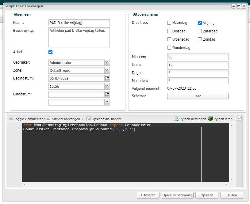 Als je een telling periodiek wilt uitvoeren, dan kan je hier op de volgende manier een taak voor inrichten: